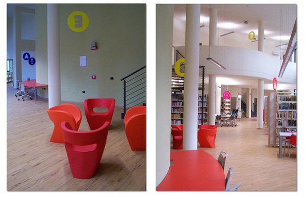 CASALGRANDE CULTURAL CENTRETHE LIBRARYSignage system in laser cutted plexiglass icons hanging from the ceiling