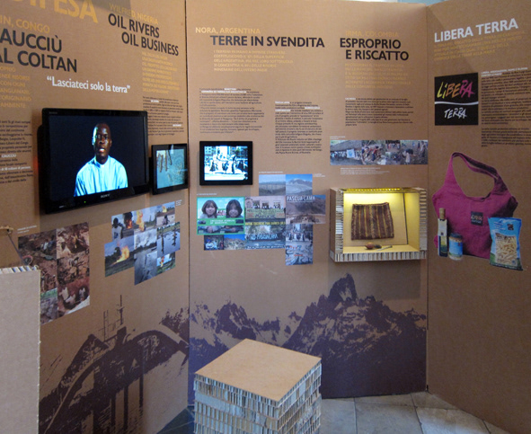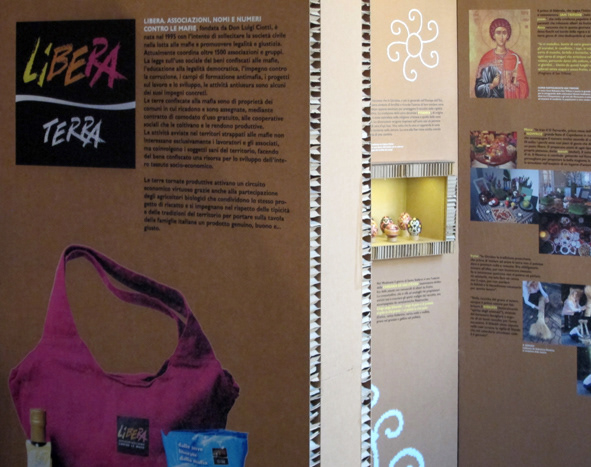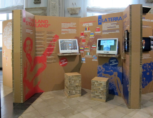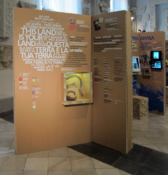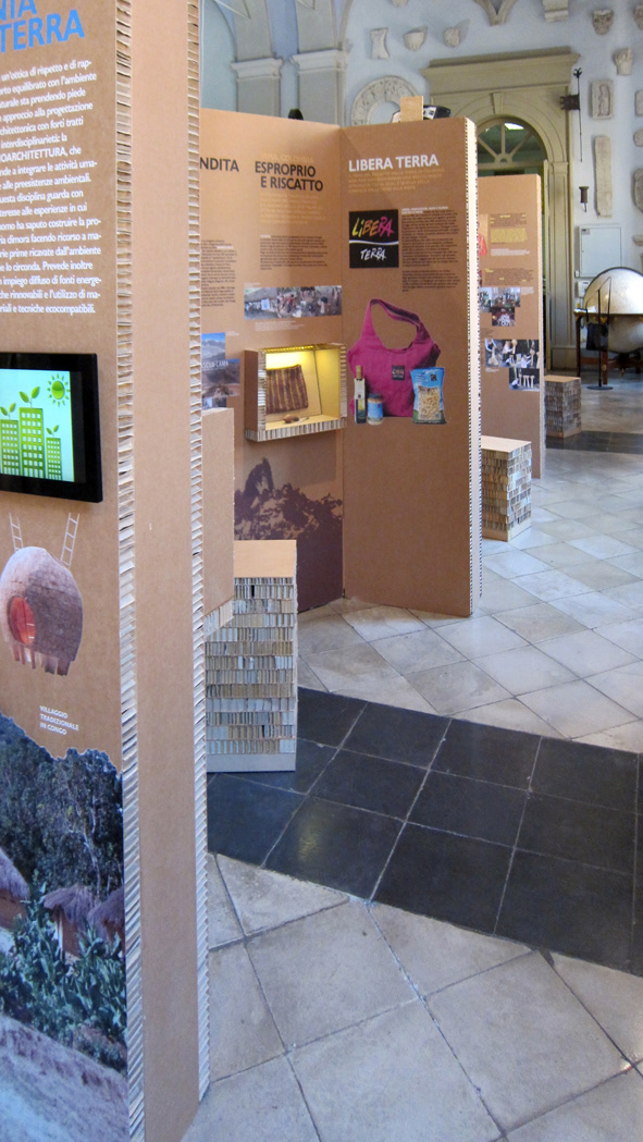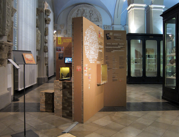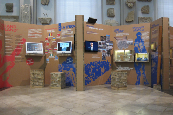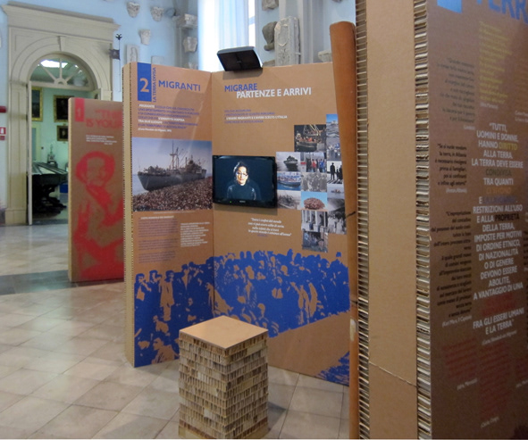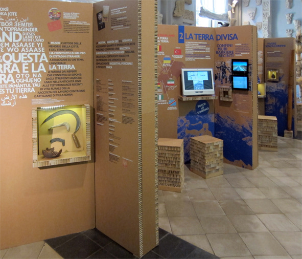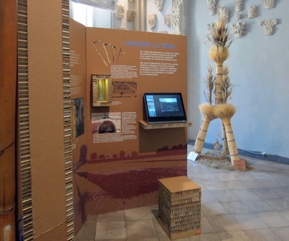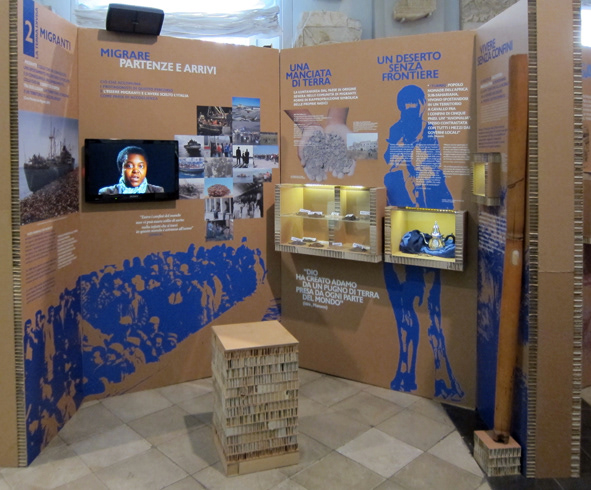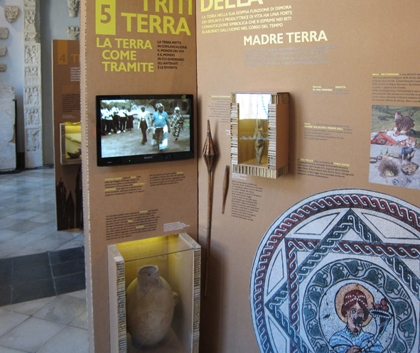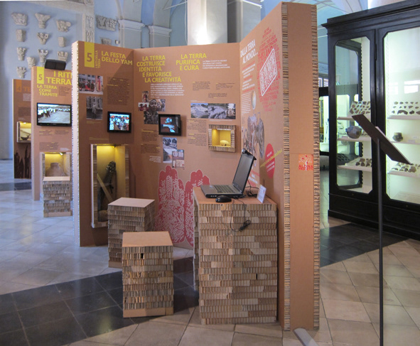 The structure, in corrugated cardboard designed by arch. Aldina Gozzi, holds touch screens and techas in which there are objects of the different cultures compared with object from archaeological excavations.
